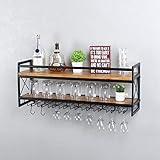 Industrial style design floating twotier shelf with 5 rows for hanging fits up to 2 wine glasses per row 10 total or 2 coffee mugs per row 10 total or 3 champagne flutes per row 15 total shelf holds up to 12 standard size wine bottles made of melamine wood and steel with black finish wine bottles glasses not included measures approximately 2362 l x 787 w x 2037 h 1462 h between shelves