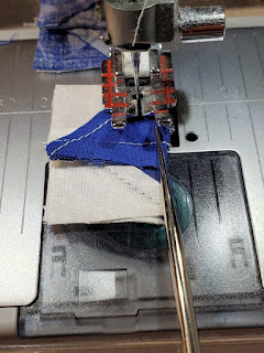 In this photo, I'm sewing a four-patch together. The darn thing is almost as big as my presser foot. This is a case where the stiletto comes in extremely handy. The seams are almost as big as what you see on the front!!