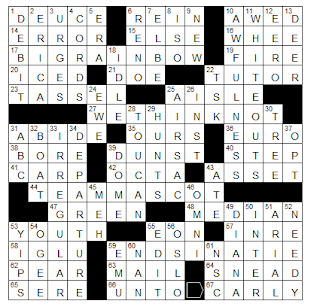 Theme: ENDS IN A TIE (59. Concludes with no clear winner ... and what each answer to a starred clue does?)