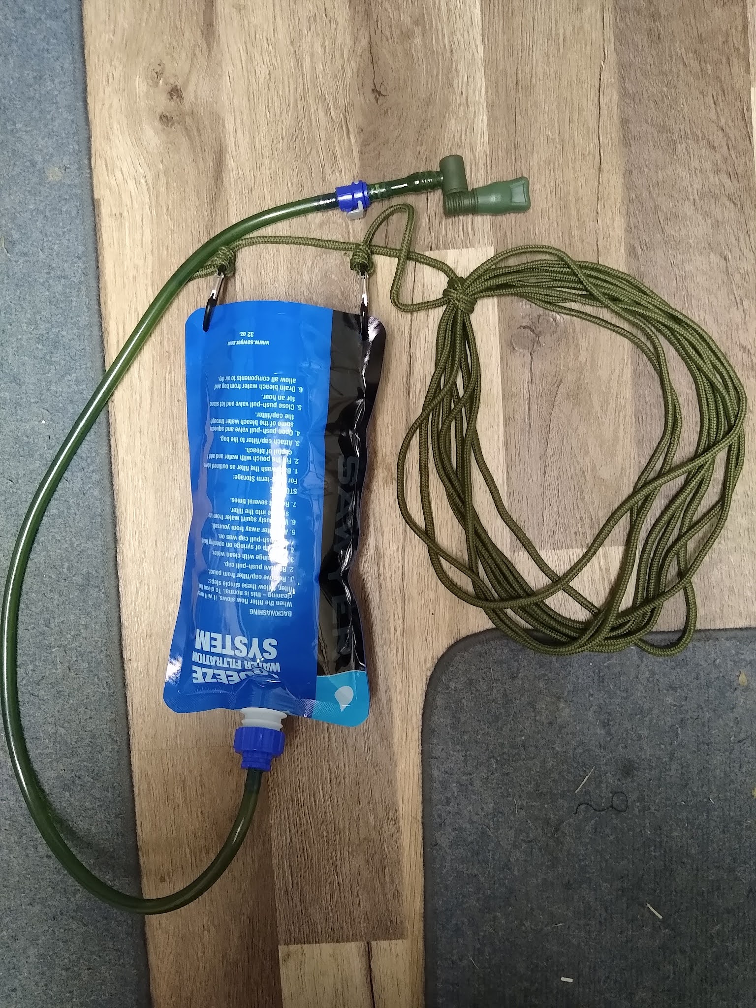 The end result is a hands-free, wearable drink pouch that uses gravity, not squeezing, to send water to my mouth. By tying the rope to carabiners instead of directly to the pouch I can switch between pouches as necessary. The extra rope disperses the weight across my neck for a more comfortable fit. It's sort of a poor man's CamelBak.