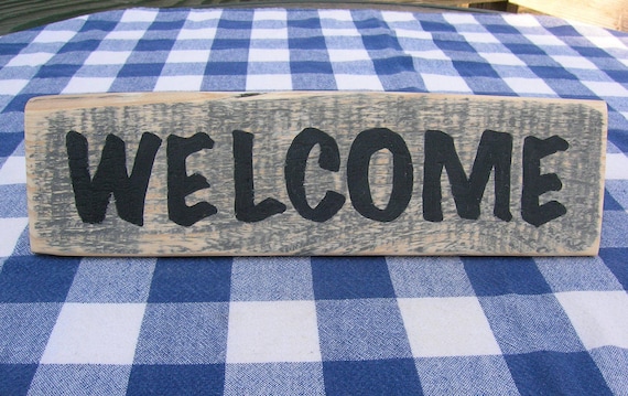 Welcome rustic wood sign - stained gray and distressed. "Welcome" has been hand-painted in black.